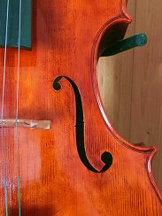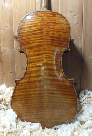 Violino nuovo. La vernice è ad alcool mettendo in risalto la bellezza del fondo in particolare. La sua sonorità brillante e ricca è molto interessante. La tavola è dei riflessi di maschiatura sull'abete. Monta delle corde Vision solo